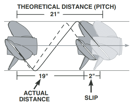 Calculate Propeller Slip: RPM div by GEAR RATIO x PITCH div by 1056 = Theoretical Speed. Then you divide the customers actual (gps) speed by the Theoretical speed to get propeller efficiency. For Example: 5500 div by 2.07 x 20 div by 1056 = 50.23mph. If customer speed is 44.00mph the propeller efficiency is 87.59% or 12.41% propeller slip.